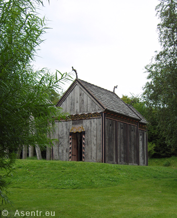 b) Ein größeres Kulthaus (Blóthús, Blótstaðr, Godahús, Heligistaðr), in dem man sich zur kultischen Handlung versammelte (Gamla Uppsala, Uppåkra). - Ein heiliger Bereich in einem Hofkomplex, zum Beispiel ein Gebäude oder ein eingezäunter Bereich neben einer Halle (Lunda, Tissø).