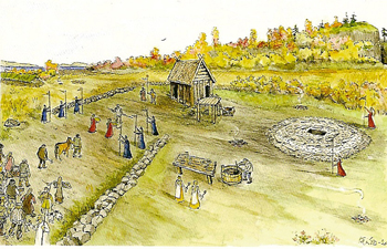 - Zuletzt das Langhaus in Doppelverwendung als Wohn- und Kulthalle (Hofstaðir).