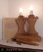Unterhalb der Galerie steht unser Eheleuchter, der uns mit ähnlichen Worten überreicht wurde: „Er soll euch Sinnzeichen und Erinnerung an euren Eid sein. Bewahrt ihn in eurem Hause an einem Ehrenplatz. Sein Licht möge Jahr für Jahr eine Brücke zwischen den Dahingeschiedenen und den einst Kommenden sein.“ Er stammt aus den Händen eines Holzbildhauers und wurde aus heimischer Eiche mit zwei handgetriebenen Messingschälchen gefertigt. Seine Grundform stellt die Lebensrune dar, deren Botschaft die Entfaltung des Lebens ist, wie man sie zum Beispiel auch im Naturvorbild des Tannenzweigs wiederfindet. Der Leuchter ist das Zeichen der ruhenden Mitte in der Familie. Er „verwandelt“ sich vom Eheleuchter in den Familienleuchter, sobald das erste Kind da ist. Der Holzbildhauer verwahrt das Zwischenstück aus der Mitte der beiden Lebensrunen in seiner Werkstatt und formt daraus eine neue, kleinere Lebensrune, die fortan zwischen den beiden „Elternrunen“ steht. An der Seite des Leuchters befinden sich die beiden Sinngaben Schlüssel und Messer und der Familien-Thorshammer, mit dem die Verbindung geweiht wurde. Der Schlüssel ist das Zeichen der verheirateten Frau und ihrer „Hausgewalt“. Das Messer versinnbildlicht die Pflicht des Mannes, seiner Familie Schutz und Verteidigung zu gewährleisten.