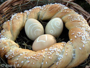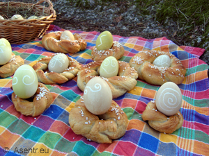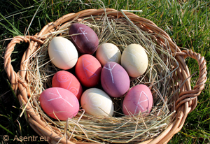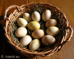 Im skandinavischen Bereich ist Eostra / Ostara gar nicht zu finden. Ostaras nordgermanische Entsprechung könnte Idun sein, die die Äpfel der Jugend für die Götter verwahrt. Denkbar wäre auch, daß Freya mit dem Fest in Verbindung steht. Der Hase ist das heilige Tier Ostaras, Gundarsson vermutet, daß er nur zu diesem Fest gegessen werden durfte. Dazu paßt, daß im Jahr 755 das Essen von Hasenfleisch durch Bonifatius und Papst Zacharias verboten wurde (nach Monson / Briswalter). Später wurden dann auch Kuchen und Brote in „Hasenform“ gebacken („Gebildebrote“), was z.B. auch zum Julfest üblich ist. Weiterhin sind die uns noch wohlbekannten Ostereier ein uraltes Fruchtbarkeitssymbol. Sie wurden wohl schon in früher Zeit auch gefärbt, aber wohl erst in jüngerer Zeit mit dem Hasen verbunden. Zum Färben mit natürlichen Substanzen lassen sich unter anderem Rotholz, Krappwurzel, Kamille und Schachtelhalm verwenden.