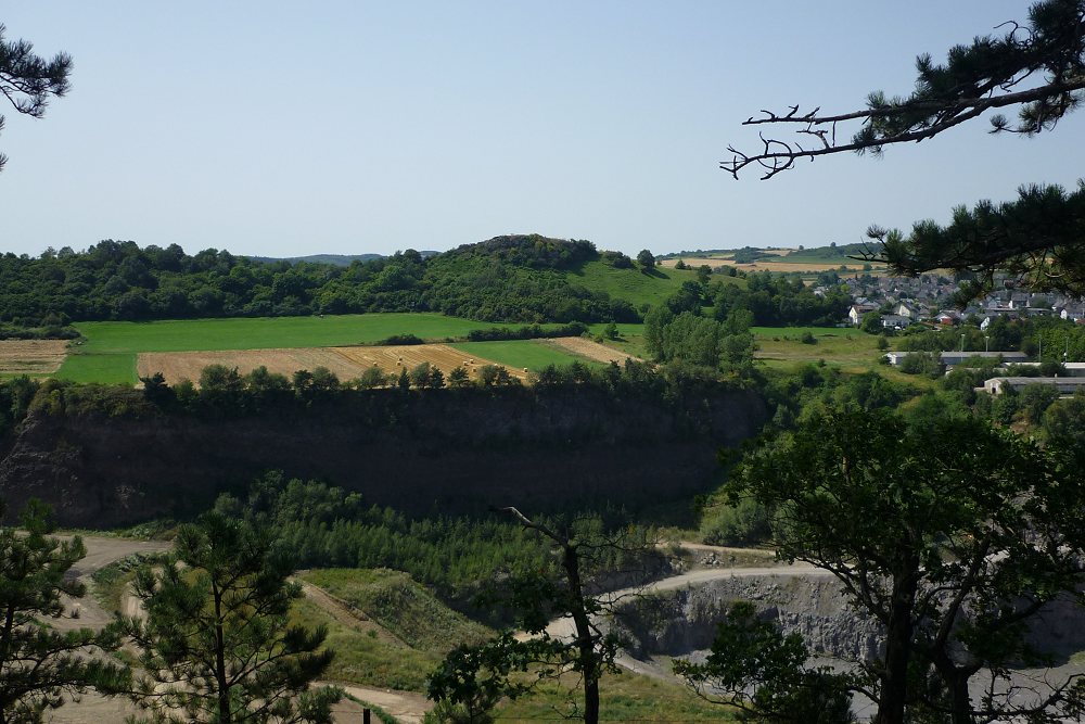1) östlich Richtung Andernach, Neuwieder Becken. Der kleine Berg rechts der Bildmitte ist der Plaidter Hümmerich, dahinter ist - winzig klein - die Spitze des Kühlturms des AKW Mülheim-Kärlich zu sehen. Im Vordergrund schaut man quasi in den ehemaligen Vulkankessel hinein.