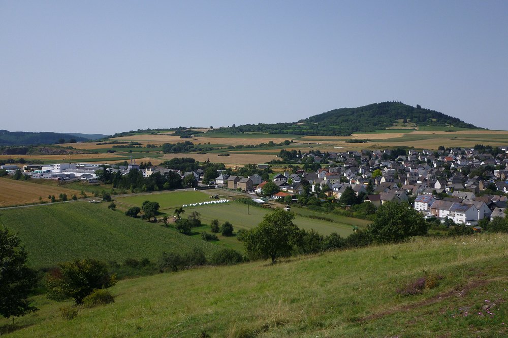 4) nordwestlich auf das Örtchen Ettringen sowie den Berg Hochsimmer im Hintergrund