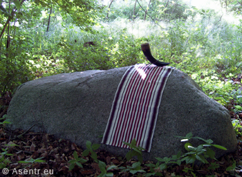 Benötigt werden ein Horn und etwas Met (bspw. die Füllmenge des Horns). Ich verwende nur selber hergestellten Met und keinen Supermarkt-Met. Alternativ würde ich Met kaufen, den der Händler selber herstellt (Imker, Wikingermarkt etc.) oder guten Imkerhonig in Wasser auflösen und als Opfergabe verwenden. Ich nehme ein Horn, aus dem ich selber niemals trinke, weil es ausschließlich für Metopfer vorgesehen ist. Dann suche ich mir eine besondere Stelle in freier Natur, einen Felsen im Wald, ein Moor, eine historische Wallanlage, eine Großsteinsetzung oder einen imposanten Baum und beginne mit dem Blót.