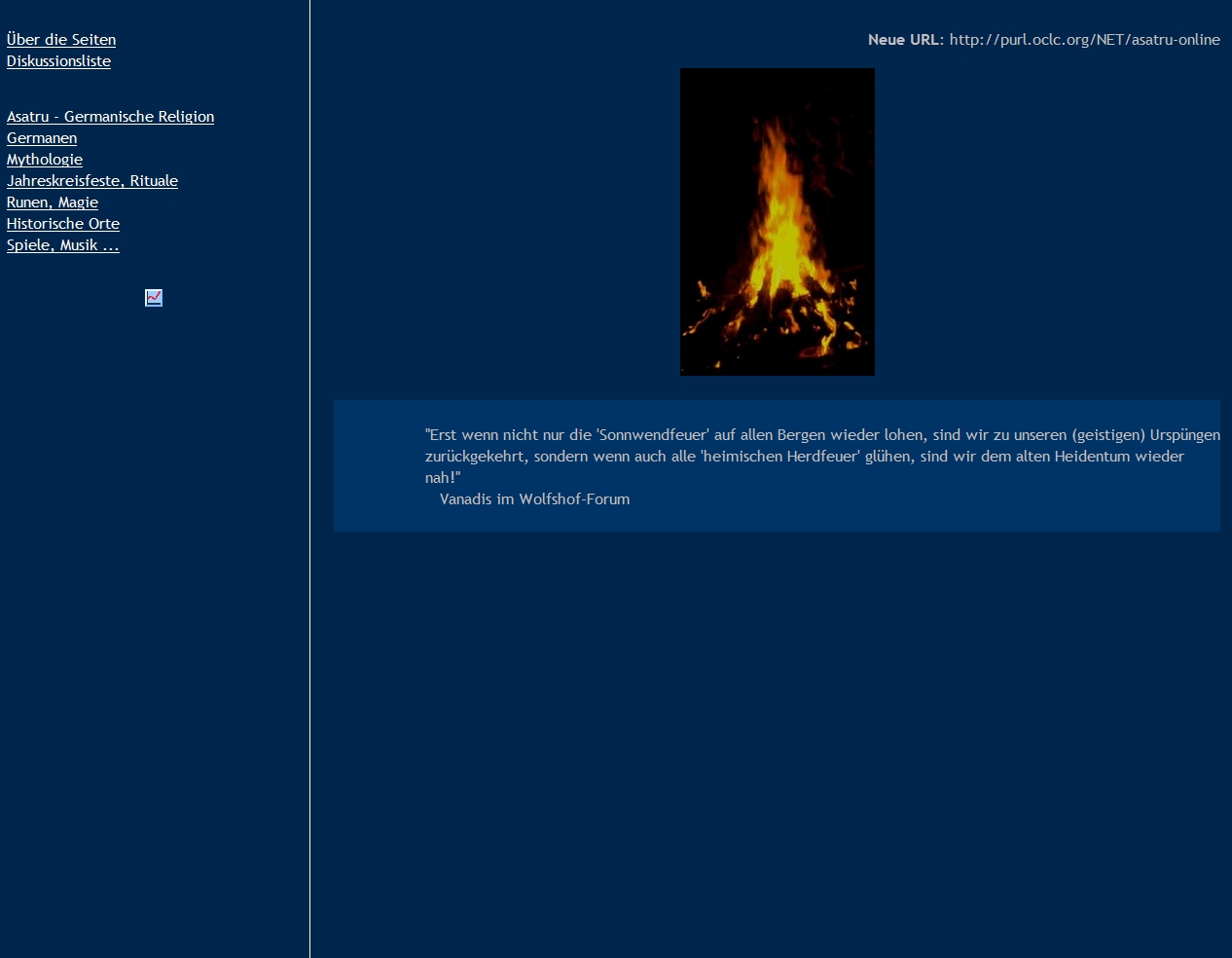 Ich glaube, daß man trotz einer gewissen Unbeständigkeit seitens des Seitenbetreibers sagen kann, daß meine Homepage eine nicht unbedeutende Funktion für Asatru in Deutschland hatte (Haimo Grebenstein schreibt im VfGH-YouTube-Kanal von mir als "Internet-Pionier im deutschen Asatru"). Dies habe ich selbst und etwas 'blind' nach unten korrigiert, indem ich mich zeitweise berufen fühlte, ein "Folkish Asatru" (Kurzerklärung / (im Prinzip) 'nicht böse') auch in unheiligen Allianzen ('böse') zu vertreten, was viele Besucher gestört haben mag. Es war ein Irrweg, schlicht und ergreifend, und weder für mich persönlich noch für die Alte Sitte im deutschsprachigen Raum hilfreich, nötig oder fördernd.