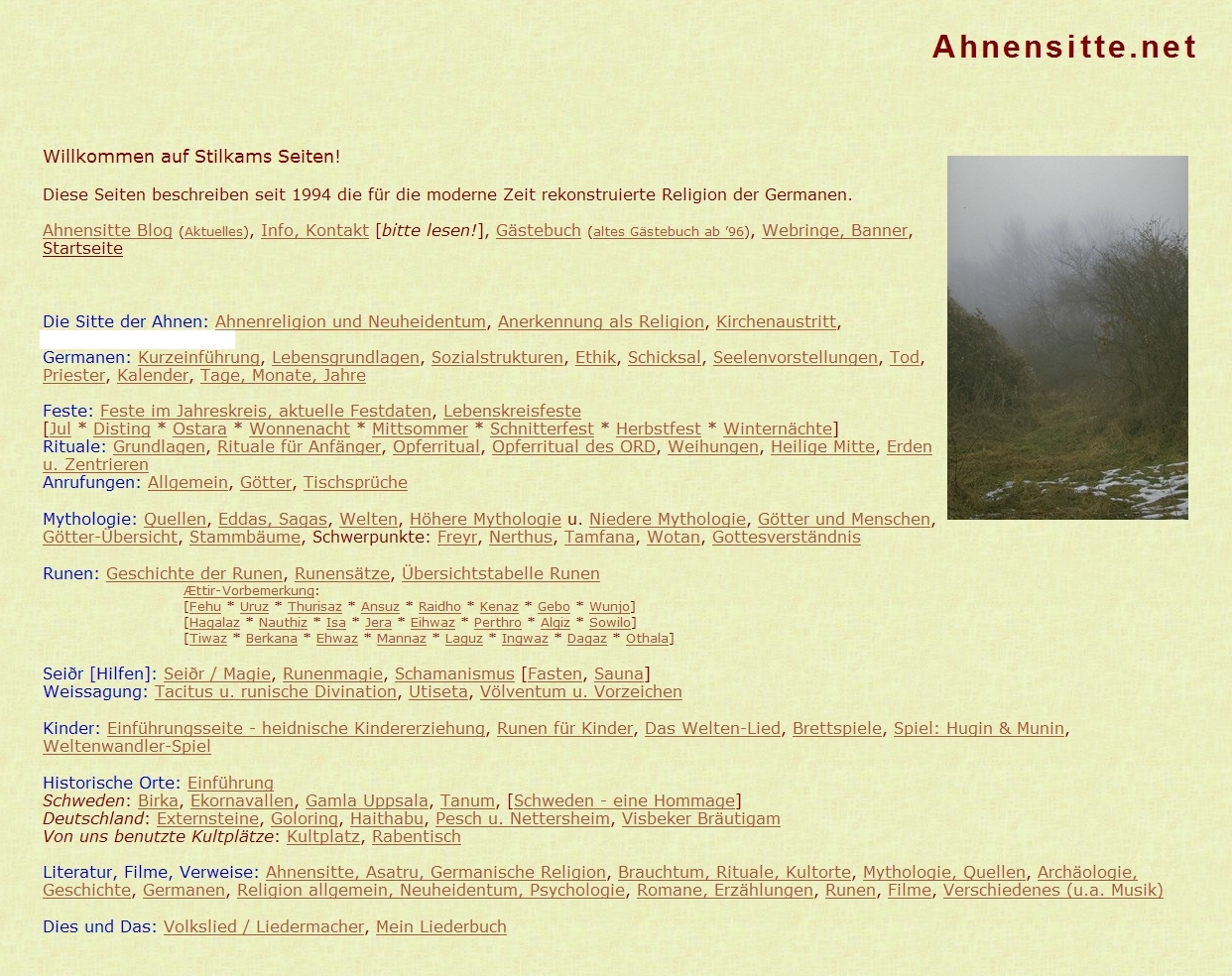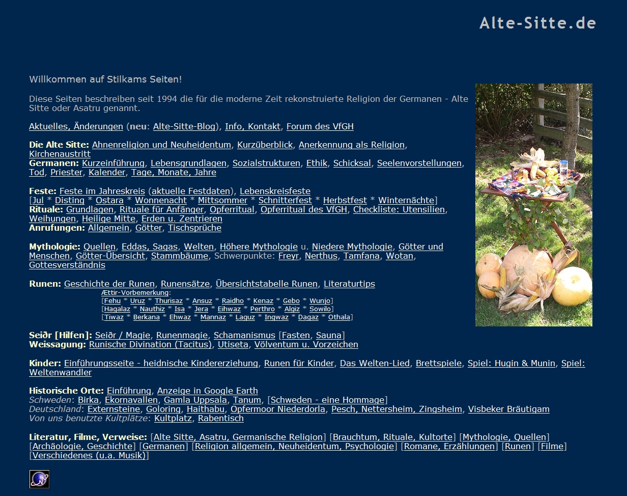 Ab 2000 präsentierten sich meine Seiten nur noch deutschsprachig unter der Domain, unter der sie am bekanntesten wurden: Asatru-Online.de. Als ich dann mal ziemlich genervt war vom Ge- und Mißbrauch des Namens Asatru, wechselte ich zu Ahnensitte.net, griff dann den v.a. im skandinavischen Bereich gebräuchlichen Begriff Alte-Sitte.de / AlteSitte.de (Forn Sed) auf. Einige dieser Domains hat zwischenzeitlich der VfGH e.V. übernommen. Wenn man auf die Vorschaubilder unter dieser Einführung klickt, kann man sich einzelne Startseiten der früheren Jahre in einem neuen Fenster anzeigen lassen. Es soll jedoch darauf hingewiesen werden, daß trotz aller Umstellungen die grundsätzlichen Inhalte zu über 90% gleich blieben.