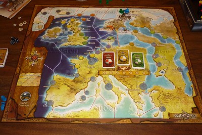 Wikinger - Die vergessenen Eroberer Dieses 2007er Brettspiel der Ragnar Brothers für 3 - 5 Spieler ab 12 wird in Deutschland von Pro Ludo [proludo.de] vertrieben (Original-Titel: Viking Fury, 2004). Das Spiel simuliert die Raub-, Handels- und Besiedelungsfahrten der Wikinger vor dem Hintergrund einer schön gestalteten Spielkarte, die alle Länder zeigt, die die Wikinger erreicht haben. Dabei ist Zentraleuropa am ehesten in korrekten Proprotionen dargestellt, der "Rest der Welt" ist freier gestaltet, so daß z.B. auch L'Anse aux Meadows noch Platz findet. Die Altersangabe "ab 12" ist nicht ganz nachvollziehbar: Ich würde sagen, das ist ab 9 gut spielbar, wenn ein Kind die Runenkarten gut lesen kann.